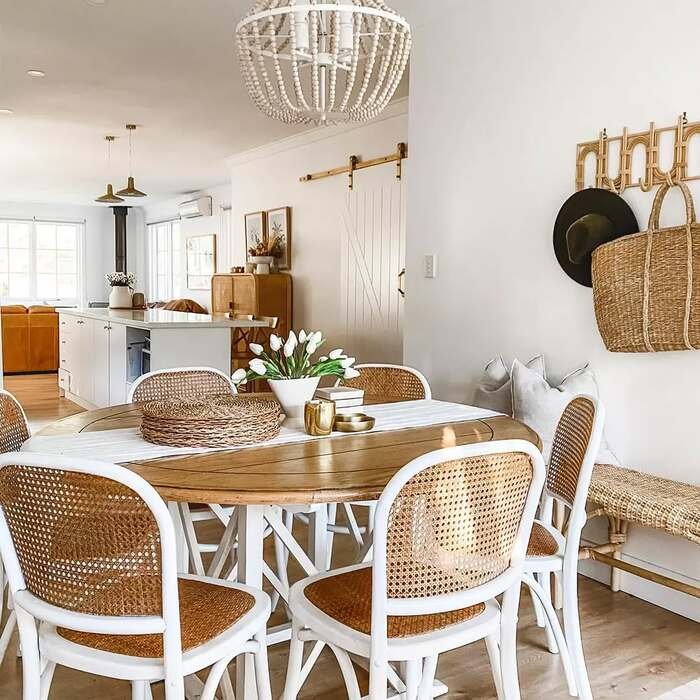 Light and airy farmhouse dining room table decor with cane chairs and soft glam beads