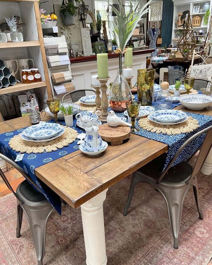 Farmhouse dining room table decor with a blue patterned runner and thrift-store treasure energy