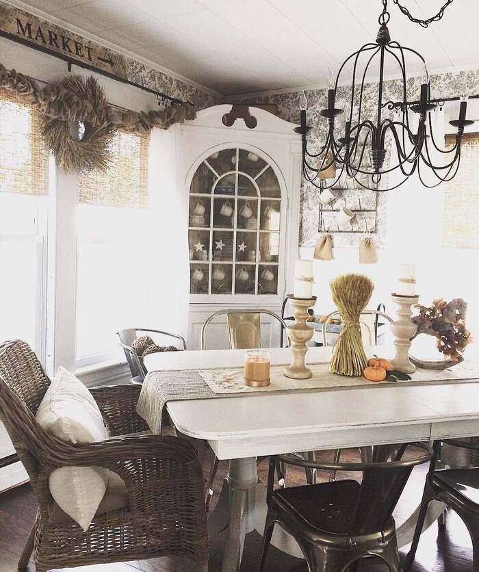 This one feels like a rainy Saturday with soup simmering. The black chandelier is curly and dramatic, but the rest of the room stays soft. For farmhouse dining room table decor with a cozy vintage vibe, the secret is layering old-looking pieces: distressed candlesticks, neutral linens, and something seasonal like mini pumpkins or dried wheat.