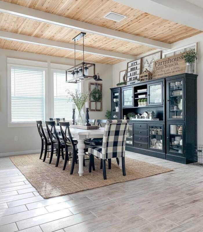 If you want this look, pick a hutch color that contrasts your walls. Black or deep charcoal looks sharp against light paint. Then keep the stuff inside simple: stacks of plates, a few baskets, and small plants. Don’t fill every shelf, leave breathing room or it gets chaotic fast. And that wood ceiling detail? If you can’t do a full ceiling, even faux beams or wood planks on one section can give you that farmhouse warmth. This is one of my favorite farmhouse dining wall decor ideas because it’s storage and style in one.
