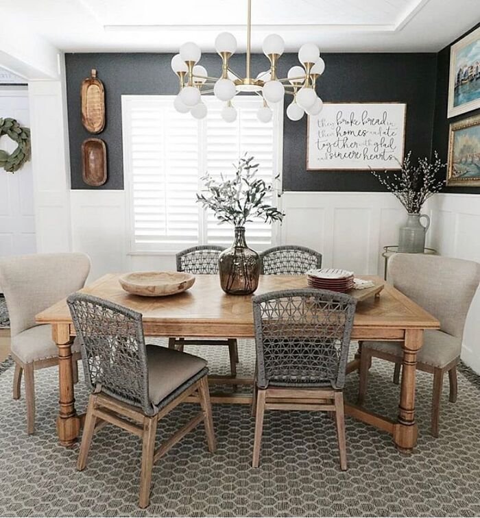 This one feels modern farmhouse, clean but still warm. The dark wall color makes the white trim pop, and the wainscoting makes the wall look finished and expensive. Then the gold chandelier adds shine. For farmhouse dining room wall decor, paint and trim are huge because they change the whole mood without needing a ton of “stuff” on the wall.