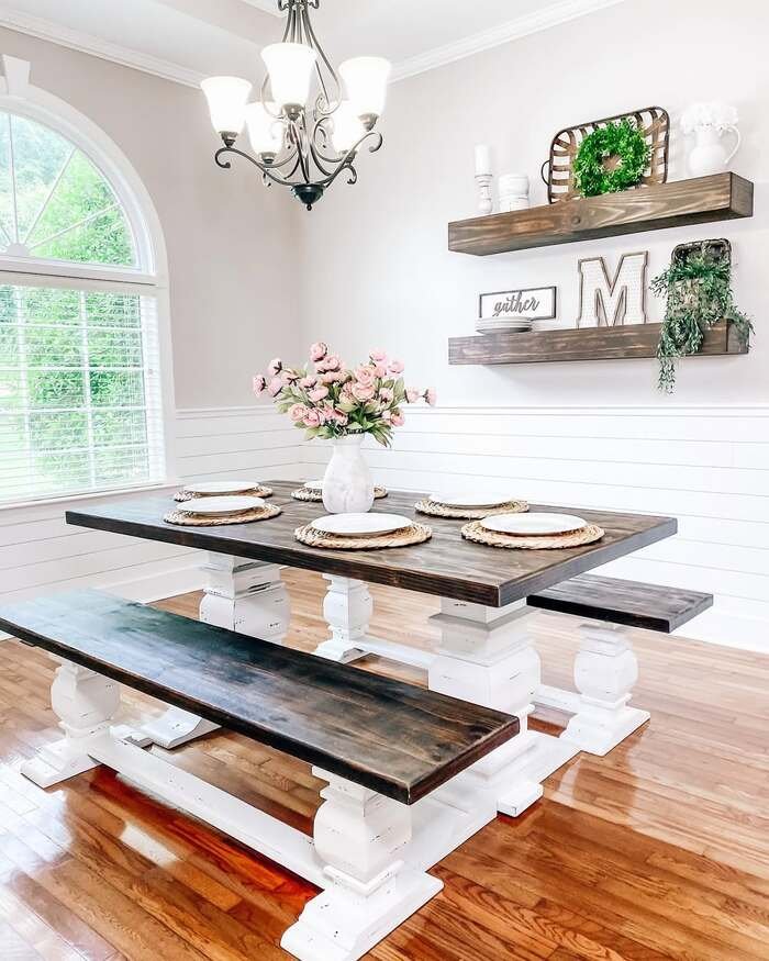This first space is bright and kinda sweet, like it smells faintly like clean laundry. The white wainscoting keeps the walls from feeling plain, and those chunky floating shelves are doing the “decor” job without a bunch of tiny frames everywhere. For farmhouse dining room wall decor, shelves are a cheat code because you can swap stuff out by season and it still looks intentional. I also like that the table is big and sturdy with benches, because it makes the room feel like it’s ready for people, not just staged for a photo.