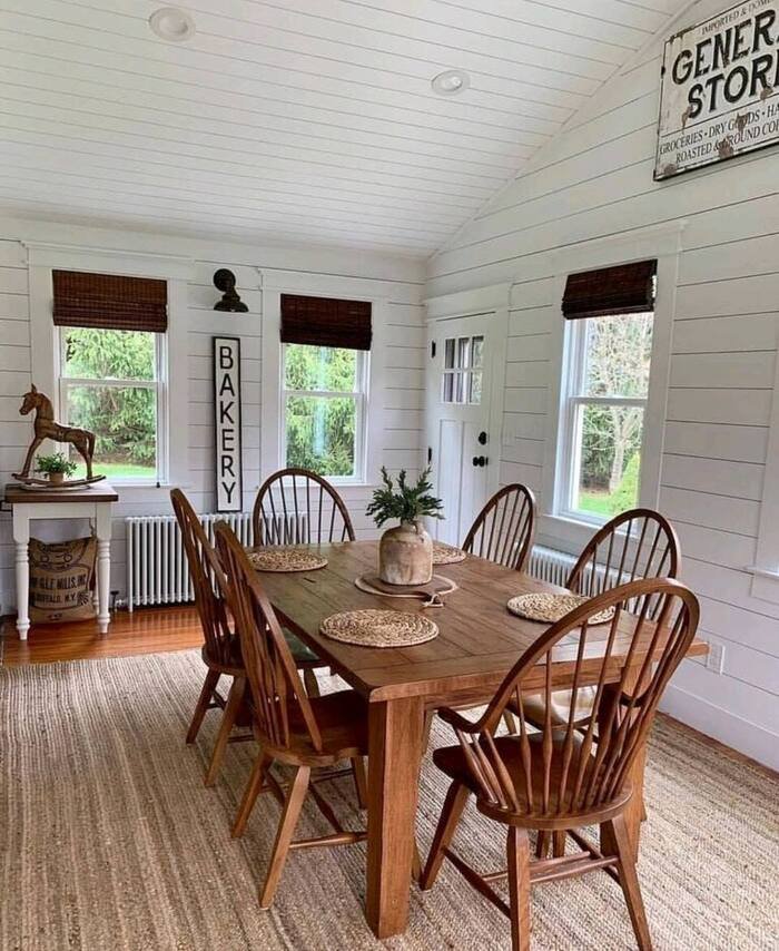 This dining room feels like a little country house, in the best way. The white plank walls give that clean farmhouse shell, then the vintage signs add personality. The “Bakery” sign leaning tall is a fun trick for farmhouse dining room wall decor because it fills vertical space without needing a gallery wall. And the “General Store” sign high up makes the room feel old-timey, like it has stories.
