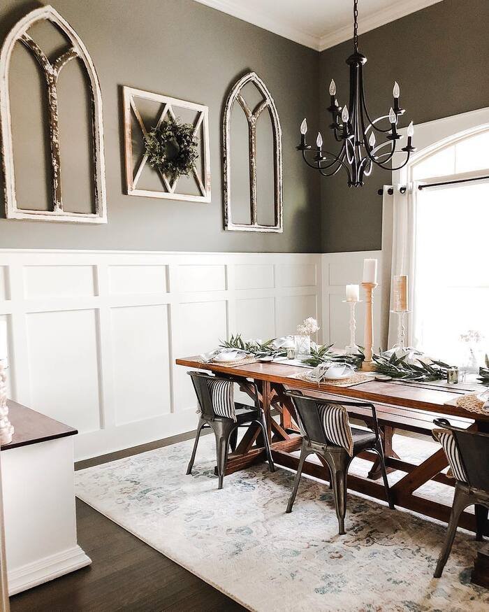 This one is a little more bold, and I’m kind of obsessed. The dark upper wall with the crisp white paneling is super classy, and the arched window frame decor gives instant farmhouse charm. It’s not even real windows, but it tricks your brain into thinking the room has more character. That’s why it works so well as farmhouse dining room wall decor. It feels architectural, like the walls have structure, not just paint.