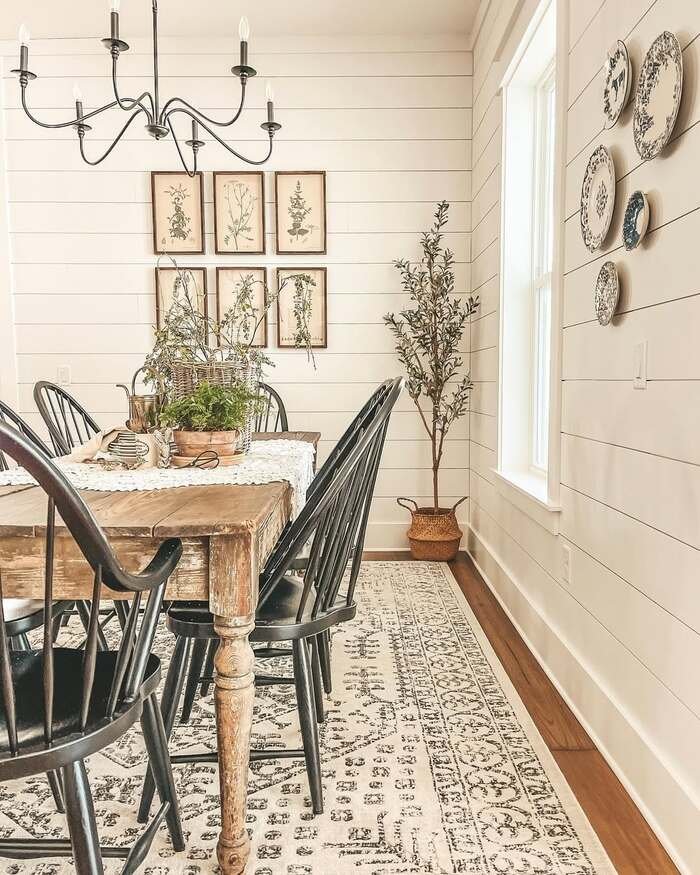 This last one feels like a perfect mix of farmhouse and calm. The shiplap walls keep it clean, then the framed botanical prints add soft detail. Botanical prints are underrated farmhouse dining room wall decor because they feel vintage but not cheesy. Then the plate wall near the window adds that old-school farmhouse charm without being heavy. It feels collected, like someone built it slowly over time.