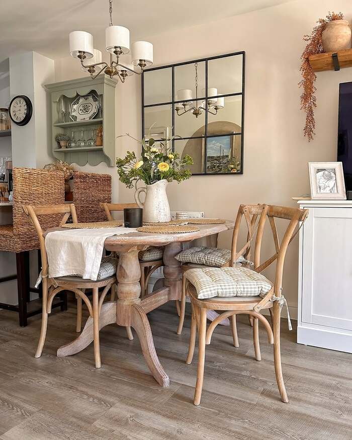To steal this idea, hang the mirror where it reflects something pretty, like a window or a light fixture. Put it above a small sideboard or buffet if you have one. Keep your tabletop decor soft and simple: a pitcher with flowers, a woven runner, maybe a candle. The chairs in the photo have cozy seat cushions, which helps the space feel lived-in. This is farmhouse wall decor for dining rooms that actually feels practical, not just “cute for a photo.”