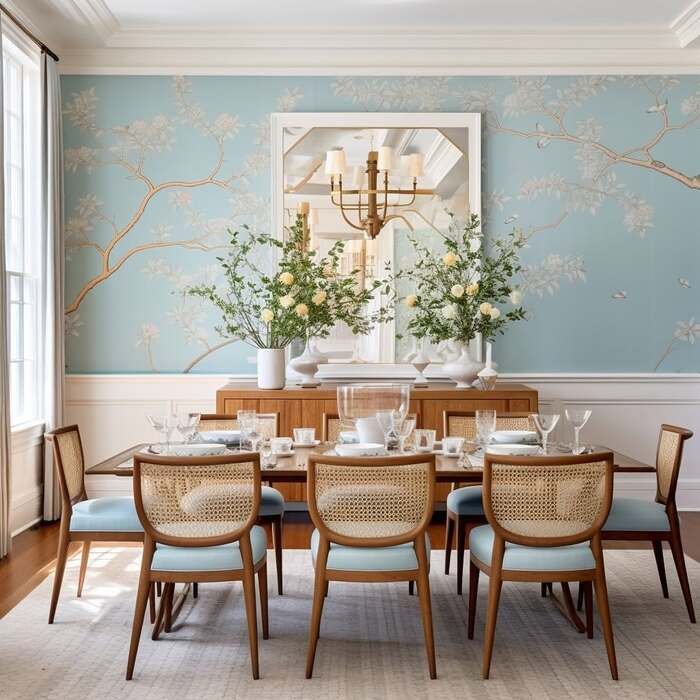 This blue wallpaper wall with branches is gorgeous, like a soft painting. It’s one of those farmhouse dining room wall decor choices that instantly makes the room feel special. And the mirror on top of the sideboard is a smart move, because it reflects the chandelier and keeps the wall from feeling too “flat.” The cane chairs add texture and keep it airy, which I really like.