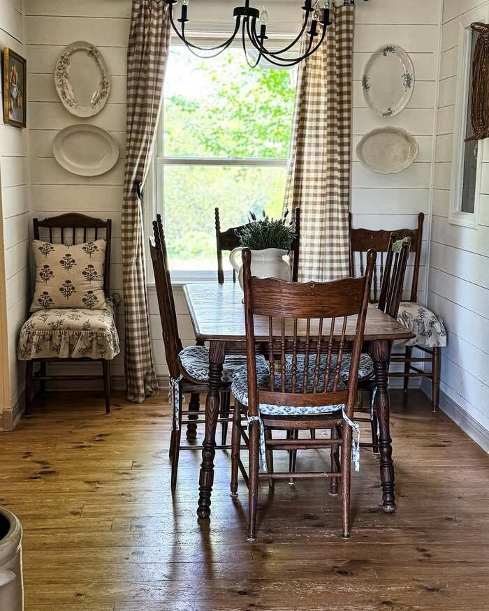 This room feels like someone’s grandma, but in a comforting way. The plates on the wall are classic farmhouse dining room wall decor, and they look charming because they’re spaced out and balanced. The gingham curtains match the farmhouse vibe without trying too hard. The chairs are mismatched in the best way, like they’ve been around forever.