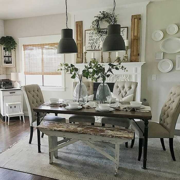 This dining room is cozy, but still looks put together. The two black pendants act like wall decor in a weird way, because they frame the space visually. And that fireplace mantel with layered signs and greenery is basically a whole backdrop. For farmhouse dining room wall decor, the mantel is prime real estate. It’s like the stage behind your table.