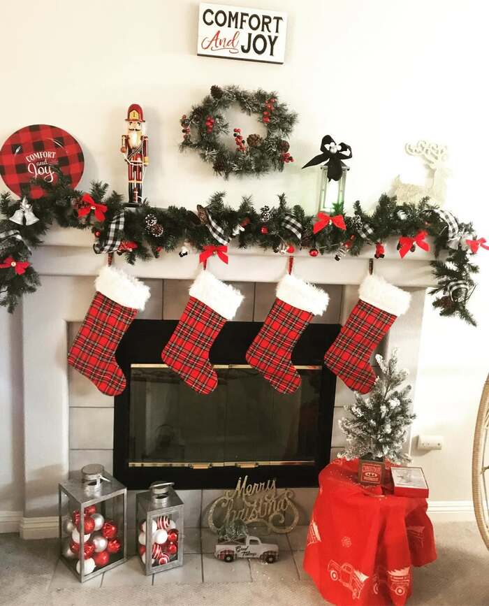 Everything about this mantel says comfortable and happy. An evergreen swag gets woven with black-and-white buffalo check ribbon and dotted with red bows. Four plaid stockings march across the front beneath a “Comfort and Joy” sign and a tiny wreath. Lanterns filled with ornaments flank the hearth, and a small flocked tree stands guard on one side.