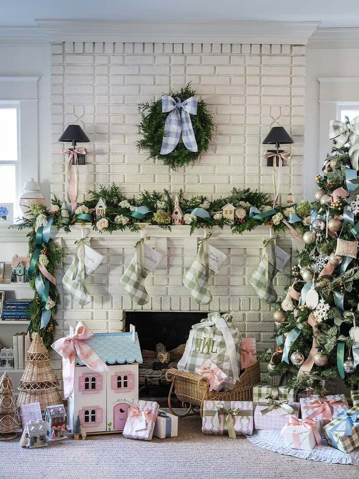 This setup feels like a sweet fairy tale landed in the living room and nobody told it to leave. The big players are pastel ribbons, sage gingham stockings, and a dollhouse with candy pink doors. It’s soft, playful, and still calm because the background is all white brick. That contrast lets the pastels pop. My confession. I used to think pastels at Christmas were risky, maybe too precious. But here the wide satin ribbons trail off the garland like sugar streamers and it just feels happy. Add a wreath with a buffalo-check bow for a bigger focal point that still whispers.