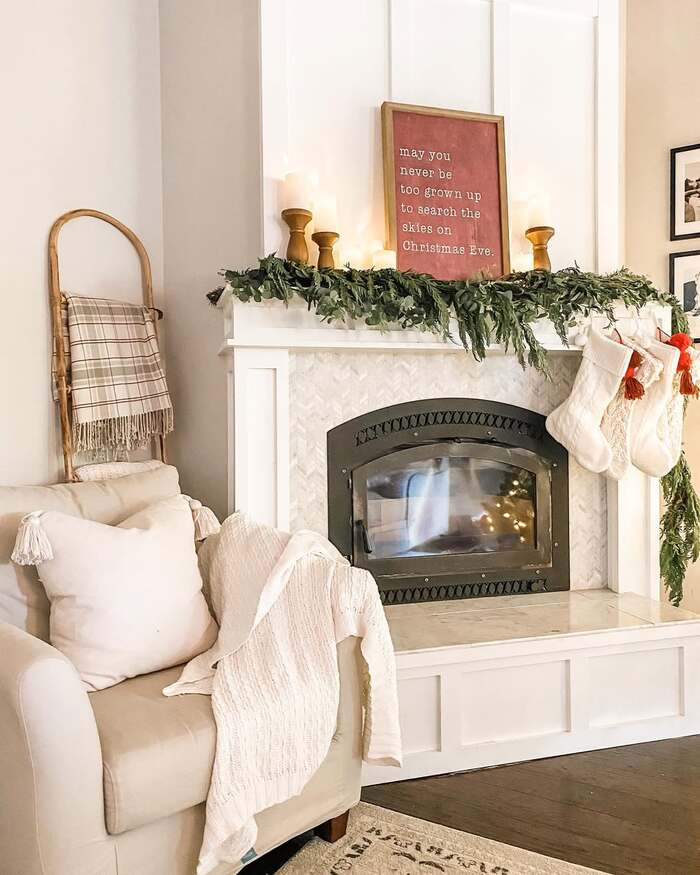 I adore this one because it calms me down on sight. White board-and-batten, a pale herringbone surround, chunky knit stockings, and a tabletop sign with a whimsical quote. The magic trick is tone-on-tone. Everything lives in the cream and oatmeal family, which automatically looks expensive and serene. Taper candles in warm brass holders build height without clutter. I can hear the soft Christmas playlist already.