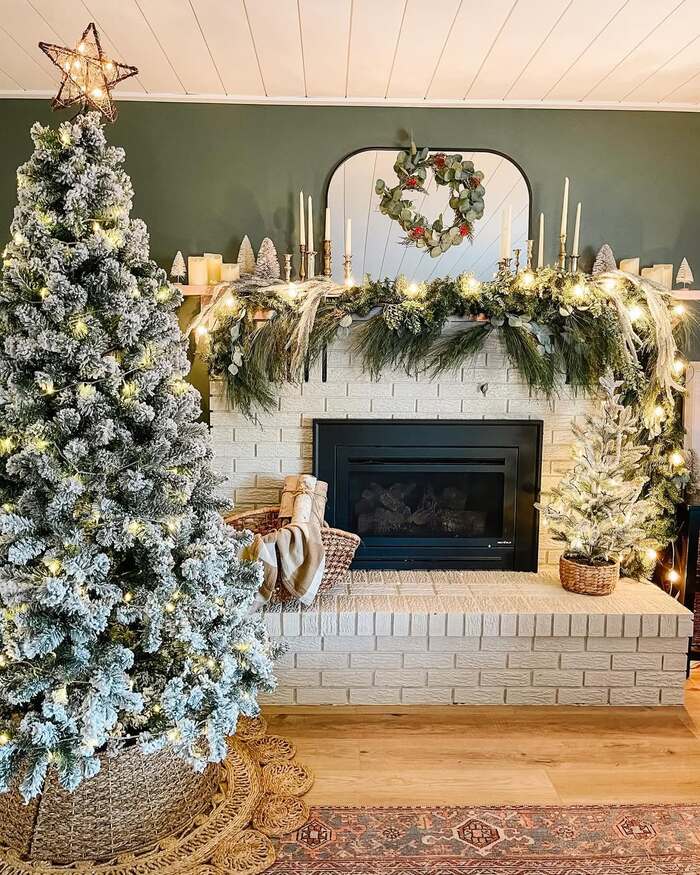This mantel gives winter cabin energy with a modern polish. A deep green wall sets the stage, then a wide mirror reflects the tree lights. The garland is full and wild, with mixed greens and soft fairy lights woven through. Tall tapers create a skyline across the shelf, which balances the large frosted tree on the left. I’m biased. This is my favorite because it feels like a breath of pine air after a long day.