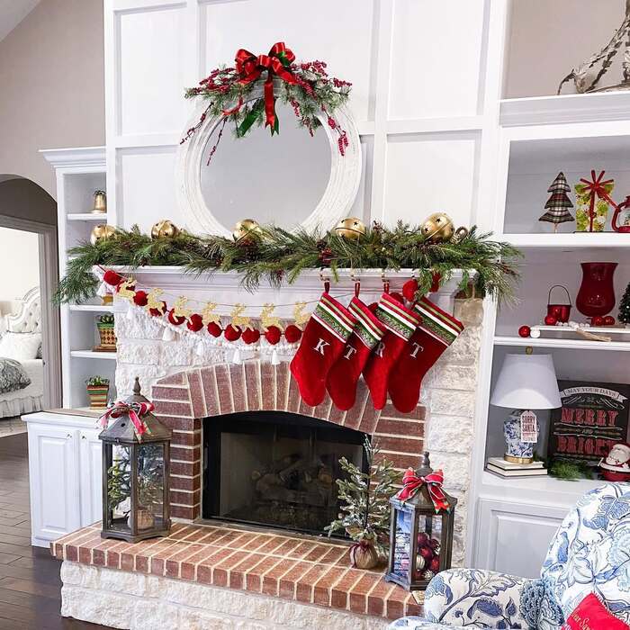 Sometimes you just want it to feel like the Christmas you grew up with. This mantel pulls traditional colors together with confidence. Real or faux cedar swag across the top, oversized red stockings with initials, a felt ball garland, and shiny gold bells. Flanking lanterns on the hearth add weight and those tiny wreaths tied with bows are adorable. It’s cheerful and not fussy. My honest opinion. Classic will never be boring if you keep the shapes big and clean.