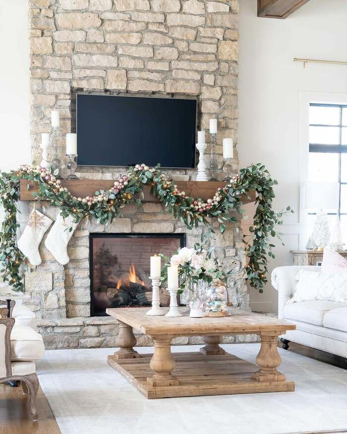 For your own Christmas mantle decor, build a long eucalyptus base and layer a second garland with cedar or juniper so it looks real. Add a few big ornaments first, then pepper in smaller ones. Group candles in threes on the mantel and repeat the tone with a floral arrangement on the coffee table. This variation on festive mantel decor is perfect if your room has lots of wood or beige. Bonus hack. If your garland droops too much in the center, tie clear fishing line to the middle and loop it over a small nail behind the TV to lift it invisibly.