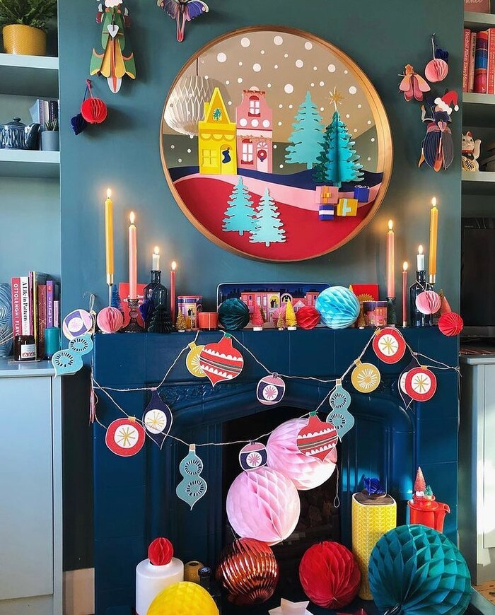 If you love color, this one probably made you grin. Teal fireplace. Round art with candy colors. Paper honeycombs, string lights, and a full-on ornament garland marching across. It’s bold and honestly pretty joyful. I know maximalist scares some folks, but the secret here is repeating shapes. Orbs in the art, orbs in the paper decor, orbs in the garland. Your eye gets a rhythm and says, okay, this is a party but it makes sense.