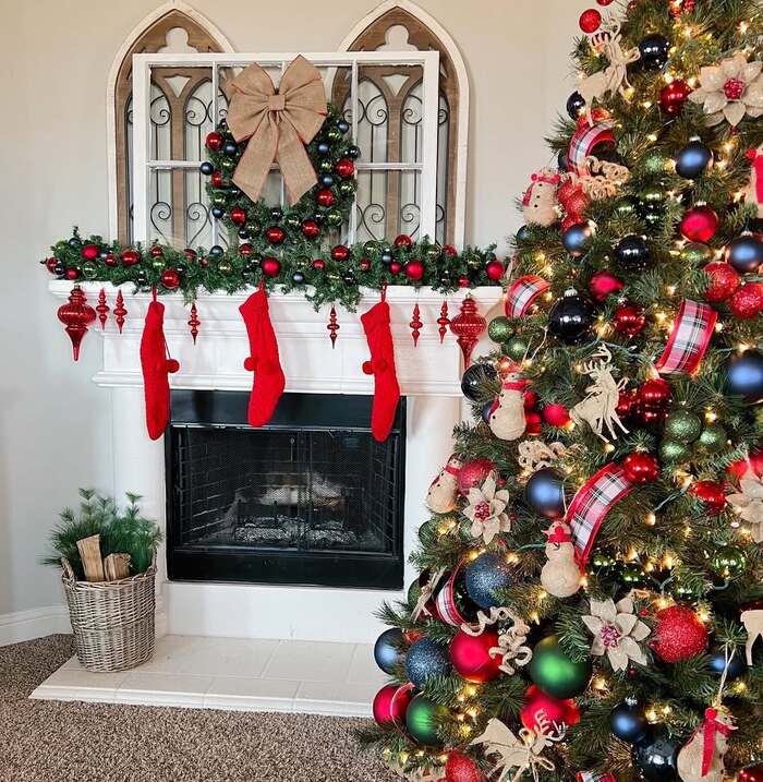 This idea leans classic but adds drama with long drop ornaments that hang from the mantel edge like tiny icicles. The wreath wears a burlap bow, the stockings are bright red, and the tree next to the fireplace is absolutely stuffed with plaid ribbon and bold baubles. It feels like Santa might actually sit down for cocoa right there. I love the energy and the old-fashioned charm.