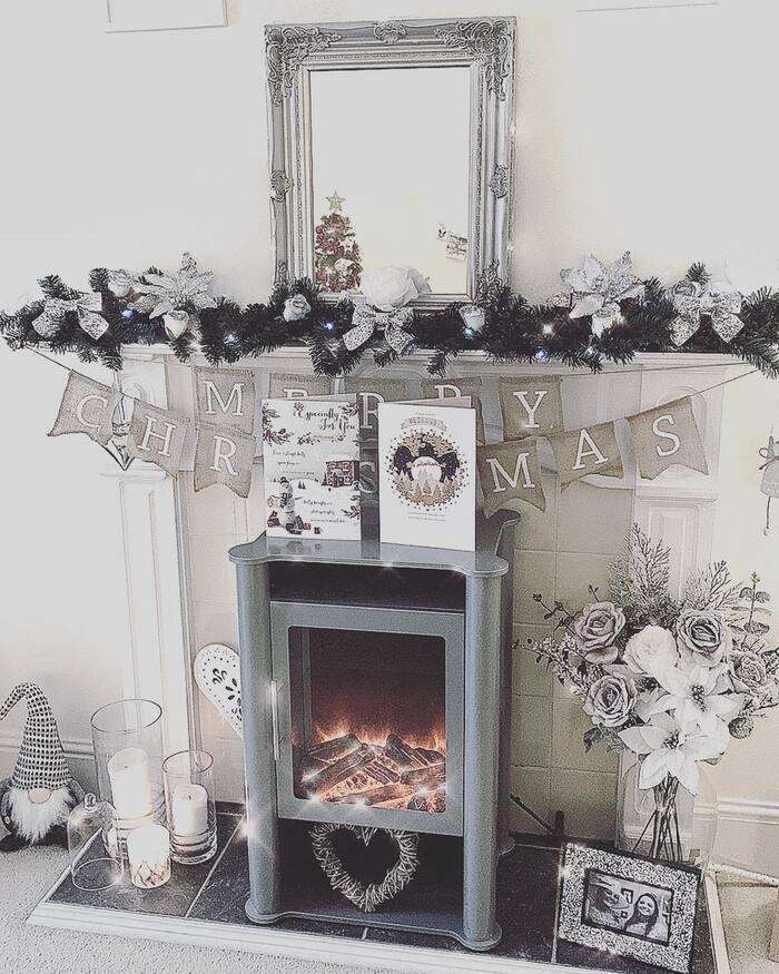 Battery candles, poinsettias, or wrapped empty boxes. Even painted birch rounds look charming in the firebox.