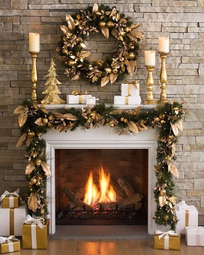 If a holiday ball had a fireplace, it would be this one. Everything is gold and perfectly balanced. Tall candlesticks, a metallic wreath, and a swag garland with big gold leaves all the way down the sides. Presents wrapped in white and gold sit like jewelry boxes under the mantle. It’s sophisticated and honestly a little dramatic which I respect.