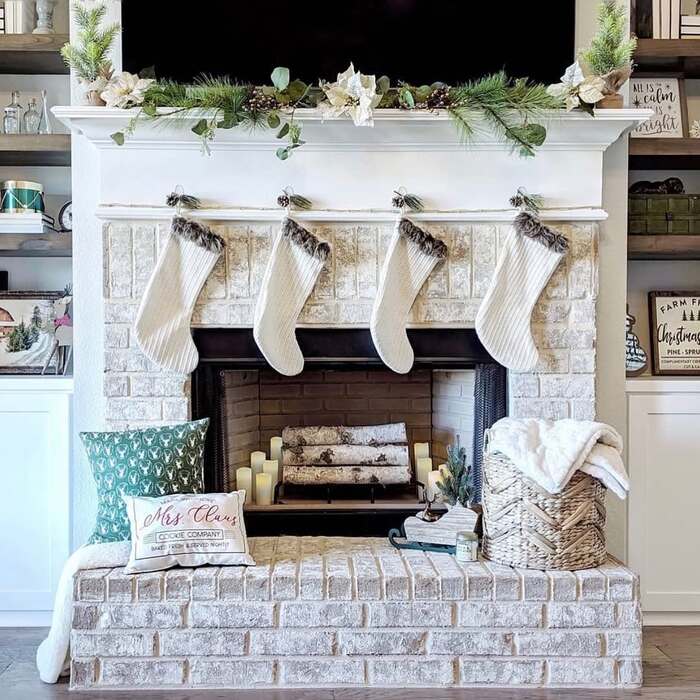 Here’s a calm palette that still feels festive. Whitewashed brick, a slim mixed-green garland, and fur-topped knit stockings hung on a white rod. The rod detail is smart. It keeps the stockings evenly spaced and saves your mantel from a dozen nails. On the sides, tall sprigs and a few large poinsettia blooms add scale. Battery candles in the firebox glow without heat, so you can pile in as many as you want.