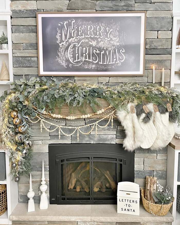 The last idea makes me feel like hot cocoa is required by law. Stone surround, shiplap shelves, and a sign that says Merry Christmas in a classic font. The garland is a cocktail of eucalyptus, pine, and frosted bits, with chunky wood bead strands and a cluster of giant brass bells on one side. Faux fur stockings hang soft and fluffy. It’s texture city in the best way.