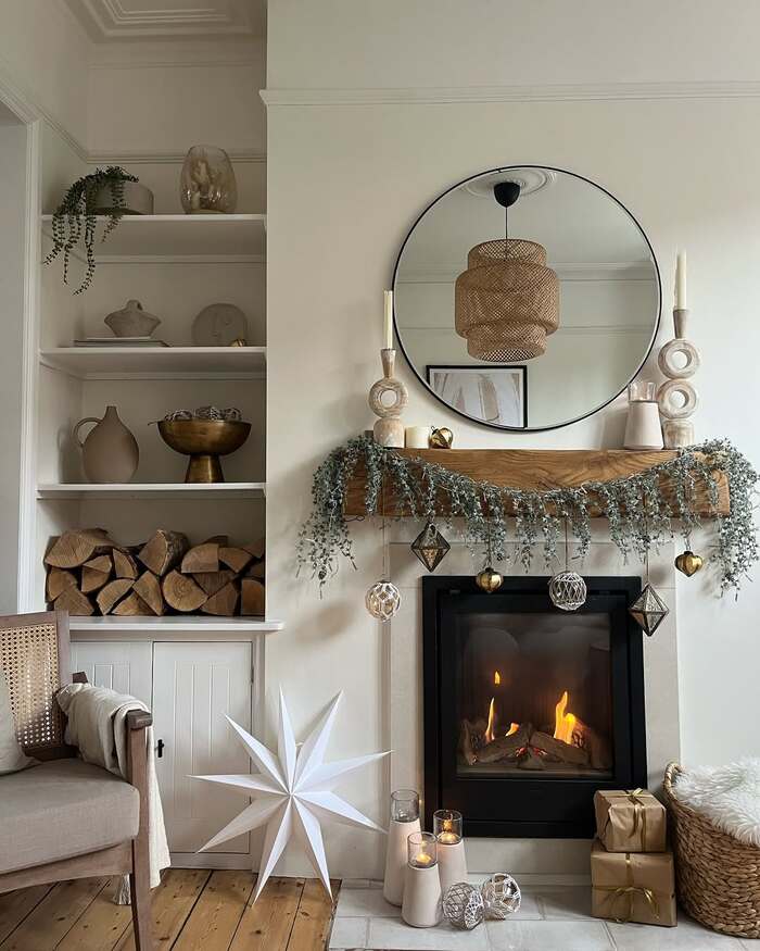 If your room leans minimal, this one whispers winter. A raw wood beam holds a droopy garland of faux eucalyptus, with small champagne ornaments dangling like dew drops. A round mirror anchors the wall, and a couple of sculptural candles keep the shapes interesting. Down low, pillar candles and kraft-wrapped gifts finish the story without noise.