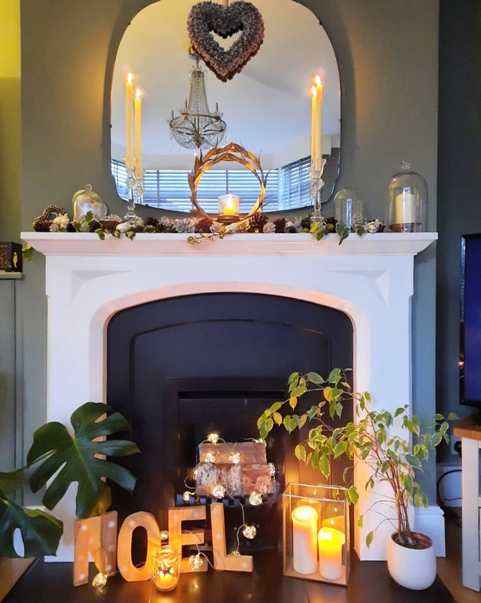 This mantel proves mood lighting is half the magic. Tapers glow in vintage holders. A low garland snakes across the top with silver pinecones peeking out. The mirror doubles the light and shows a fuzzy heart wreath. On the hearth, glass cloches, pillar candles, and the word NOEL spelled in chunky letters make the base feel intentional. A couple of houseplants soften the edges and keep it from feeling stiff.