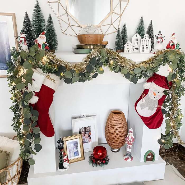 Here’s modern meets nostalgic. Bottlebrush trees and white ceramic houses march across the top, while a eucalyptus garland droops in oversized swags, layered with classic gold tinsel and warm micro lights. Red stockings with friendly characters hang on both sides, which keeps the symmetry playful rather than formal. The display sits on a sleek faux mantel, so renters can do it too.