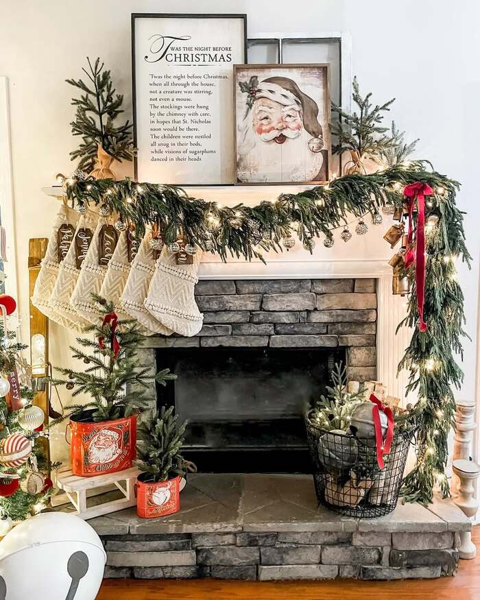 If you want that cozy-movie feeling, this one’s your winner. A thick, drippy garland lined with lights frames the mantel and even the side post. Brass bells hang on a long ribbon, and knit stockings gather under a big “Twas the Night Before Christmas” print with a sweet Santa portrait beside it. Small pines and vintage-style tins complete the old-time vibe.