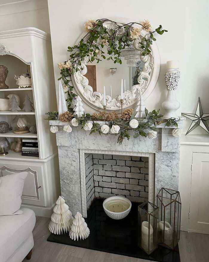 This scene is romantic and a little fancy. An ornately framed round mirror wears a sweep of greenery like a crown. Below, the marble mantel carries a delicate garland with white paper ornaments and gold seed-pod picks. Tall candlesticks and cone trees keep the silhouette tall and graceful. Clear lanterns with pillars ground the hearth without blocking those gorgeous brick-painted firebox walls.