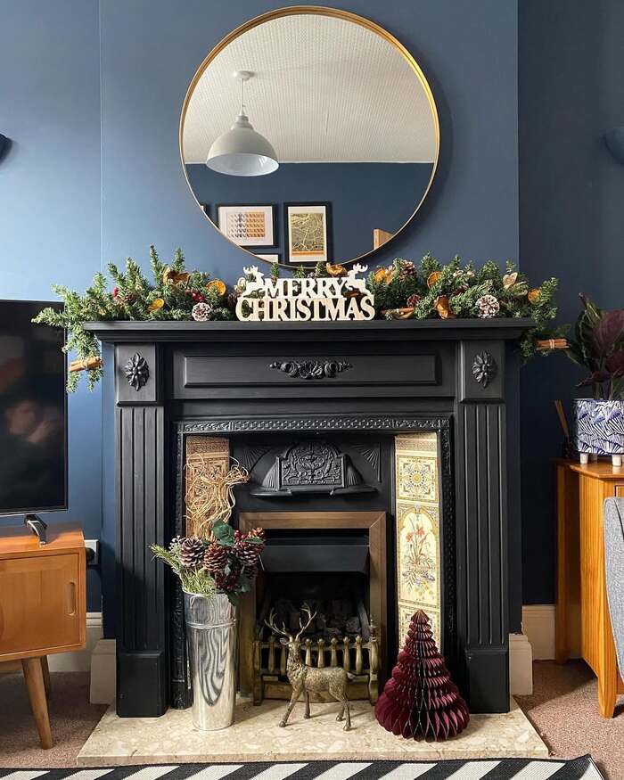 Big applause for color contrast. A charcoal-black mantel against inky blue walls sets the stage, then a chunky garland topped with dried oranges, nuts, and pinecones warms it right up. A bright “Merry Christmas” sign gives the pop, and a gold-rimmed round mirror repeats the circles. On the hearth, brass and wood accents echo the natural tones.