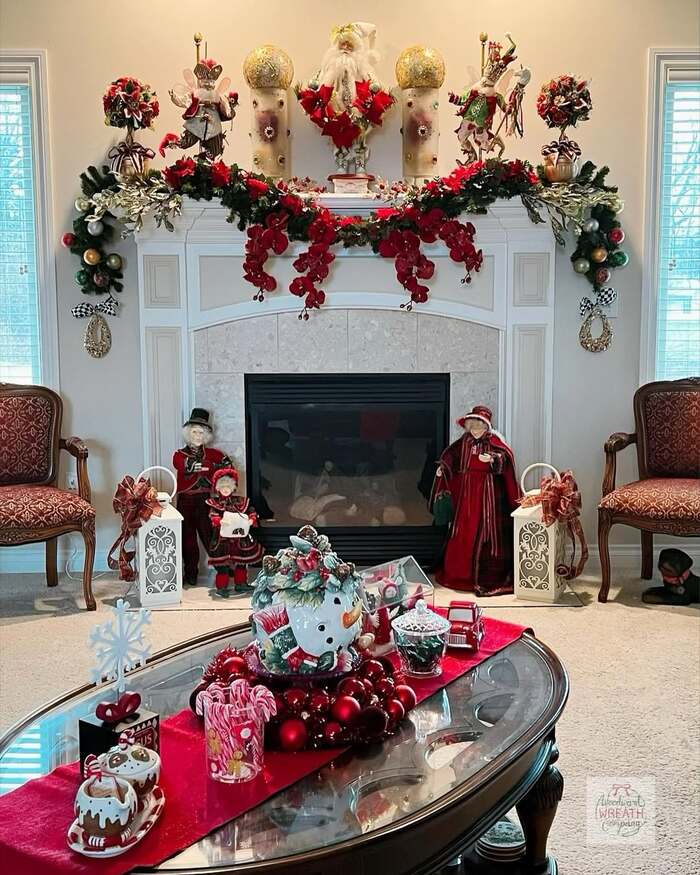 I know this one is extra, but sometimes extra is fun. Tall figurines and gold orbs crown the top. The garland is stuffed with red bows, glimmering leaves, and berries, then it plunges into long tails at the sides. The hearth becomes a stage with carolers and old-fashioned lanterns. On the coffee table, a red runner and candy canes echo the story.