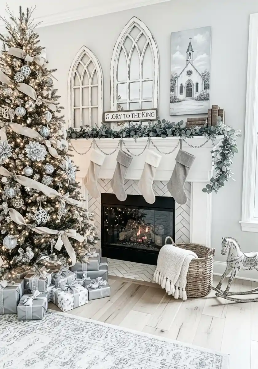 Distressed Gothic arch mirrors lean romantic right away. Center a “Glory to the King” plaque on a snowy eucalyptus garland for a meaningful focal point. The white fireplace with herringbone tile and orderly stockings in cream and gray is clean and hush-quiet. Beside a silver-and-white ribboned tree, silvery wrapped gifts and a vintage rocking horse add heirloom charm.