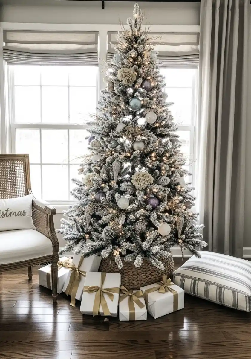 Pastels in winter feel brave in the best way. Snow-dusted branches tucked with mercury glass, soft silver, and pale lavender baubles read elegant and cool. The woven tree collar is a must for texture, and I love gold-tied white packages for a refined but simple finish. Stone-colored drapery and cane furniture keep everything muted and très chic, not sugary.