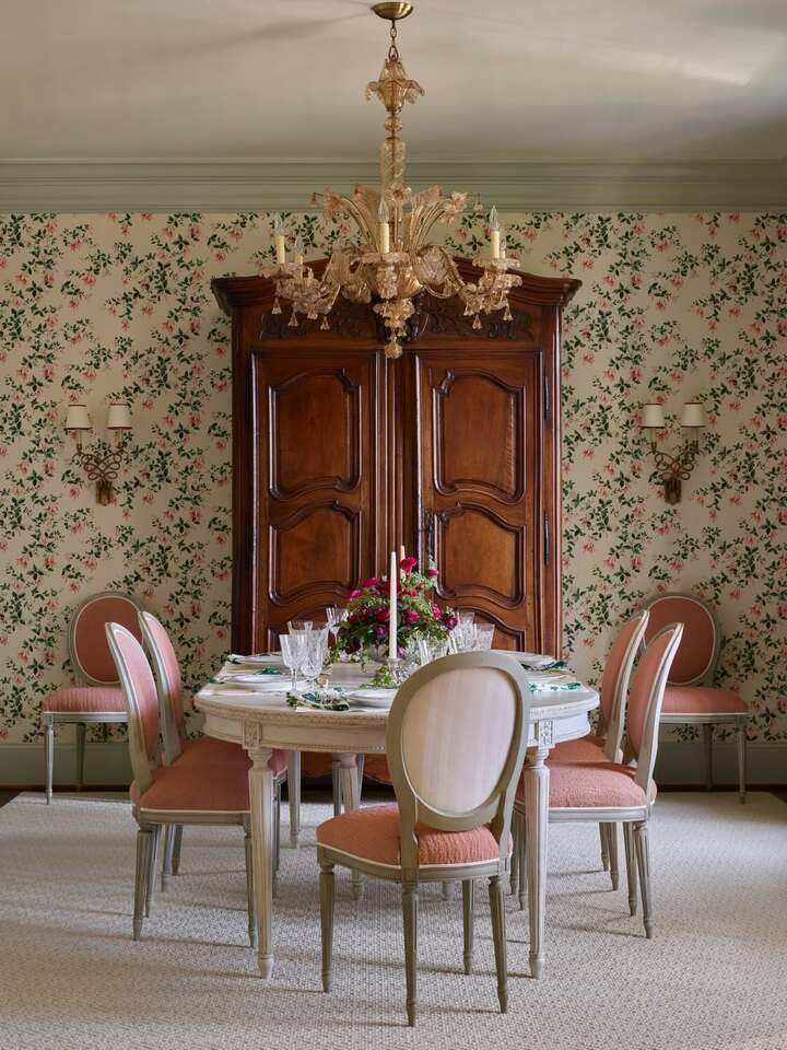 French country dining room decor: floral wallpaper, crystal chandelier, and soft pink seats