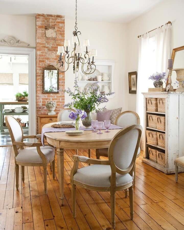 This room is the one I’d copy if I wanted my house to feel warm the second people walk in. The brick column is imperfect in the best way, like it’s been there forever and nobody tried to “fix” it. Then you’ve got those honey-toned wood floors, which makes everything glow, even with simple white walls. The round table is what really gets me though. It feels like nobody is stuck at the “bad end” of the table, so dinner automatically feels kinder. That’s a sneaky little win in french country dining room decor.