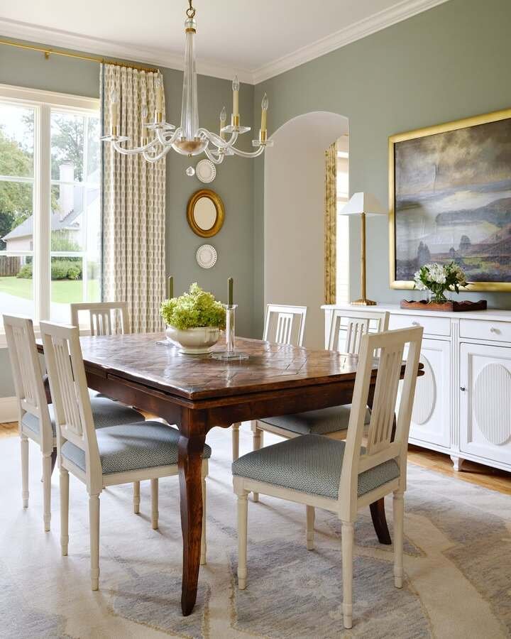 Sage green walls, a dark wood table, and crisp white chairs that still feel soft