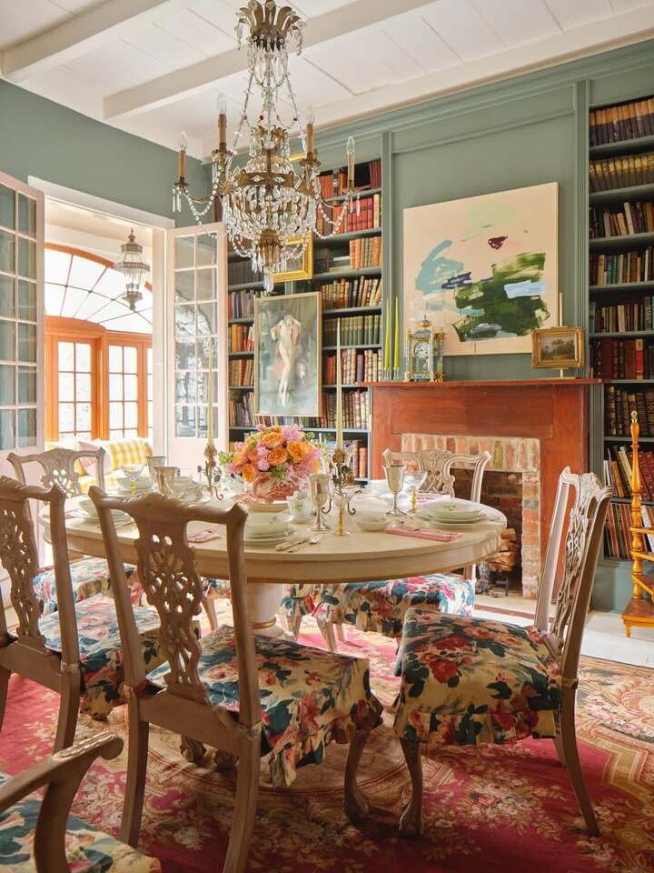 Dining room meets library, with floral chair covers and a sparkly chandelier