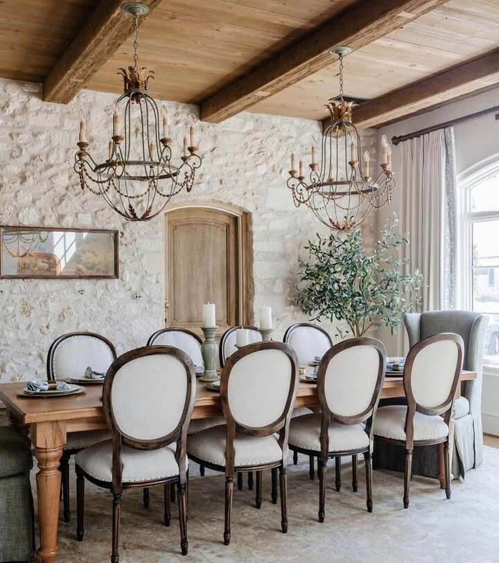 This one is for anyone who wants french country dining room decor that feels sturdy, not frilly. The stone wall has so much texture that you barely need anything else. And the thick wood ceiling beams, wow, they make the whole room feel grounded. The pair of iron chandeliers is the dramatic move, but since they’re the same style, it feels organized, not random.
