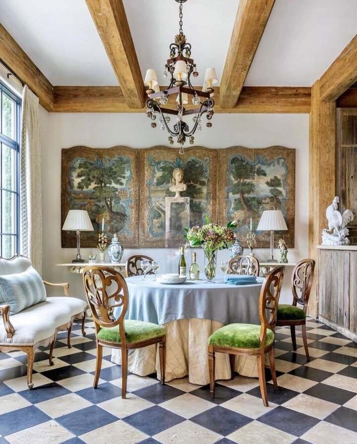 To get this French country dining room decorating feel, pick one pattern that’s classic and repeat it once. The floor is the pattern, so everything else can be simple: a round table, soft tablecloth, and warm lamps. I also like the big painted panels in back. You can fake that with thrifted screens, oversized framed prints, or even fabric stretched over canvas. A small trick: add two matching lamps on a console in the same room. It makes the space feel “done,” even if you’re still hunting for the perfect chandelier.