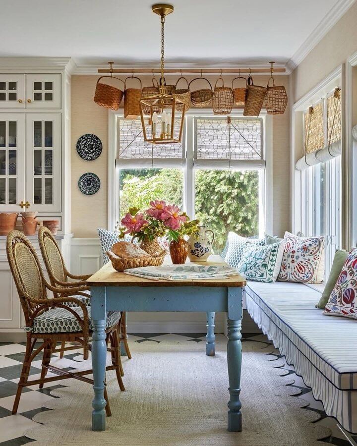 This space feels like a fresh loaf of bread. Seriously. The hanging baskets above the windows are such a smart move, because storage becomes decor, and it’s not precious about it. The blue table base adds color without being loud. And that brass lantern light fixture makes everything feel warm, like sunlight even when it’s cloudy.