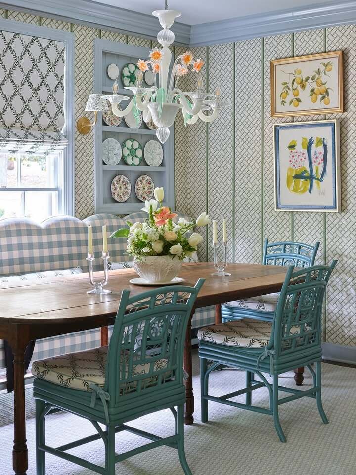 To copy this French country dining room decor style, keep your big patterns up high and your solids down low. The teal trim and banding helps the walls feel finished. Add a sideboard, then put two chunky lamps on it, one on each side. Symmetry calms a room down, even when wallpaper is doing the most. If you can, hang a mirror behind the lamps. The reflection doubles the glow at dinner and everybody’s face will seem softer, which is honestly a gift.