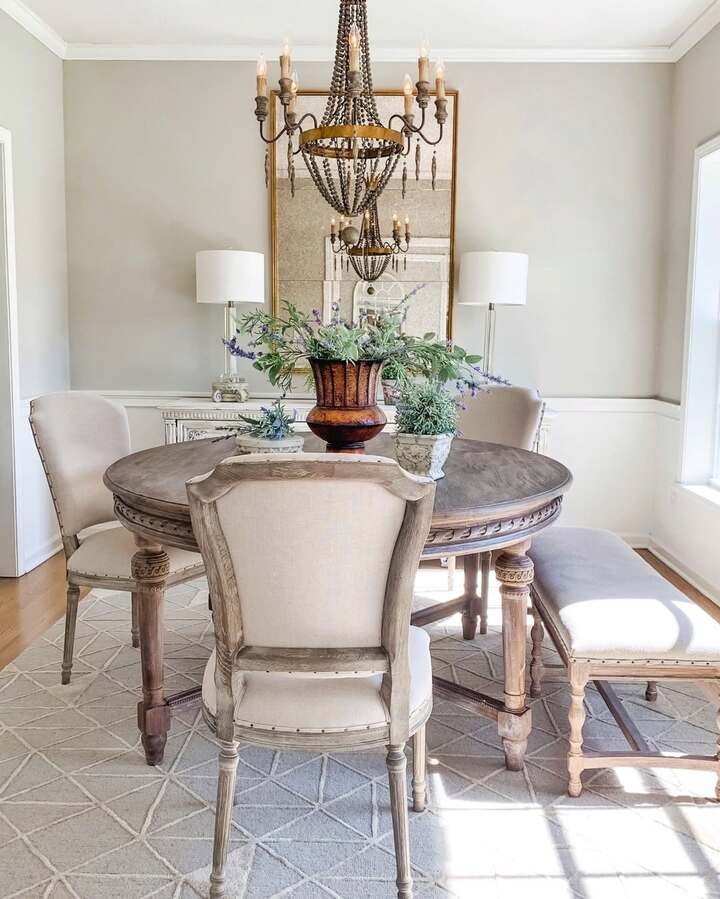This is the calm one, the “I can breathe again” room. Soft gray walls, white trim, and a big round rustic table that feels like it’s been here forever. The beaded chandelier adds texture without adding color, so it stays peaceful. The bench mixed with chairs is also a nice touch, it feels relaxed and not too formal.