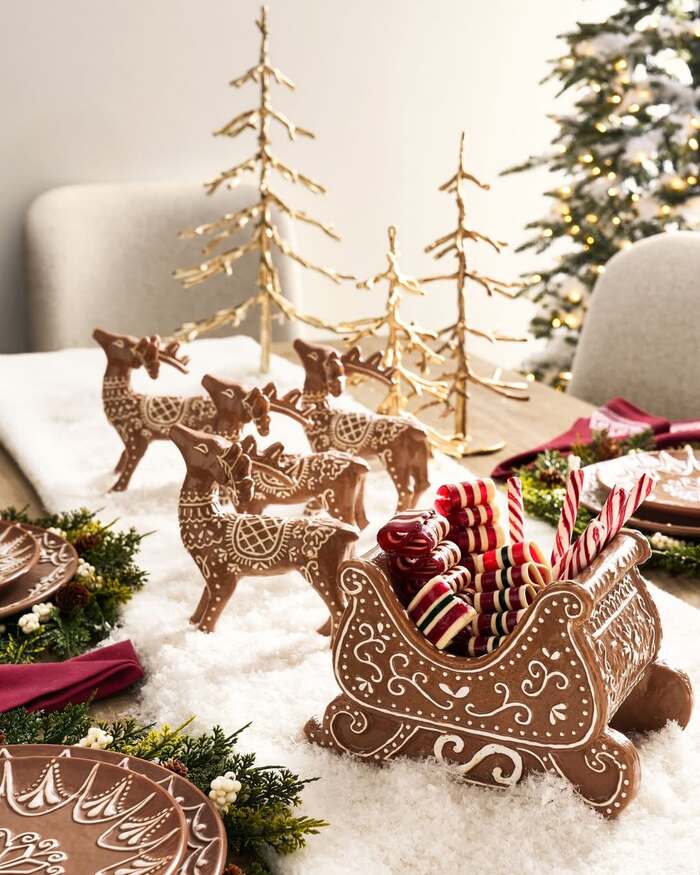 Yes. Use gingerbread cutouts, candy-cane bundles, and a cookie-brown wreath bow. Keep shapes simple and repeat white “icing” outlines.