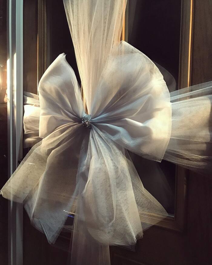 Okay, this idea made me grin like a kid. You literally wrap the door like a present. For front door holiday decorations, buy two long rolls of soft tulle or organza. Measure the door height and width, then add about 15 percent extra for the knot and tails.