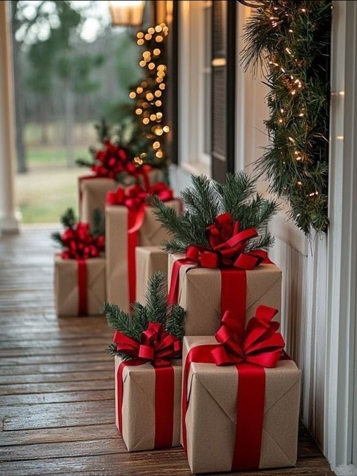 Nothing says welcome like a tower of gifts you can’t open. I make weatherproof faux presents for front porch Christmas decorations using lightweight plastic bins from the dollar aisle. Wrap them with kraft paper or waterproof paper, then add wide red ribbon in a cross pattern. Hot glue the ribbon only to itself, not the paper, so you can reuse it next year. Tuck a sprig of cedar and one berry pick under each bow.