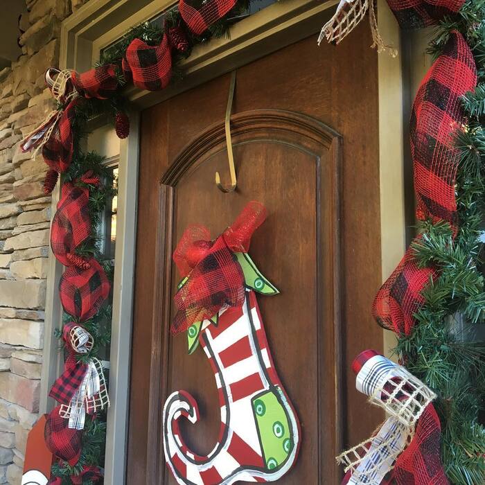 Add buffalo check bows at the corners and scatter a few striped baubles through the greens. If your door rubs the garland, move the hooks out half an inch so you don’t snag a loop. Ask me how I know. Finish with a matching striped doormat so the theme reads from a distance.