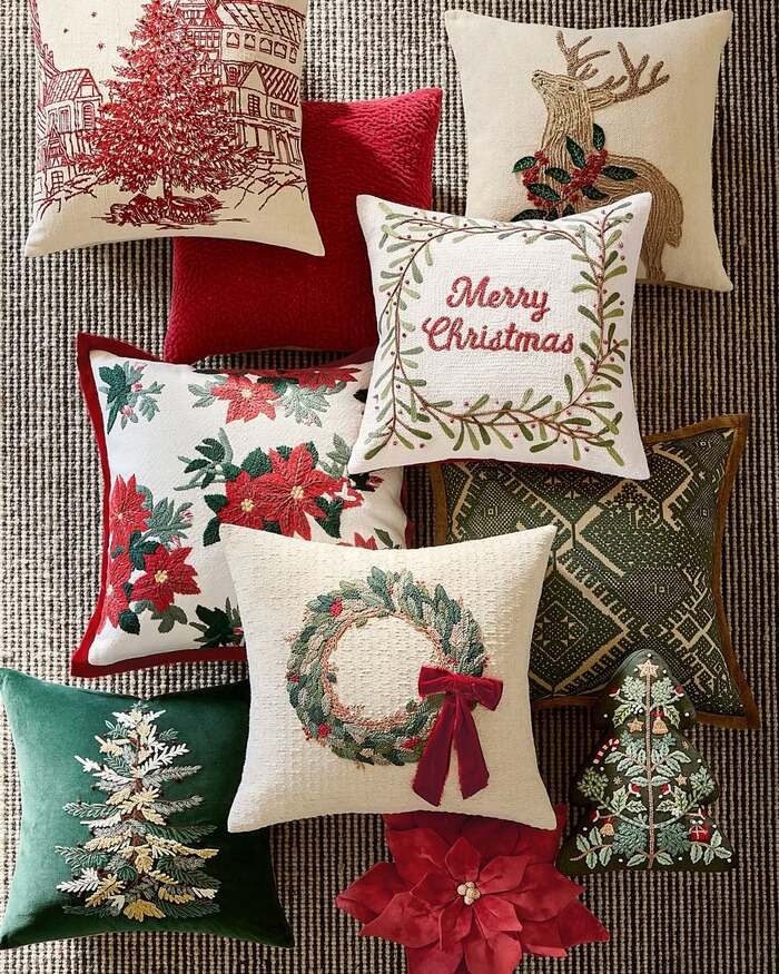 Not every porch has space for a full bench, but if you do, festive pillows are the fastest way to warm up front door Christmas decor. I tested embroidered poinsettias, wreath motifs, and a classic “Merry Christmas” script. Mix textures so it doesn’t feel flat. Nubby boucle next to smooth linen, then a velvety green pillow with a stitched tree. It looks curated but easy.