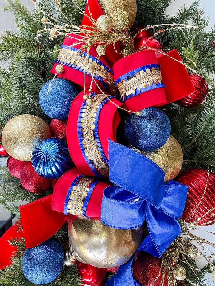 That bold bundle of red, royal blue, and gold ribbon screams Nutcracker parade in the best way. I copy the palette for front porch Christmas decorations with three wired ribbons. One red velvet, one royal blue satin, and one gold trim with little sequins. Make a giant triple bow for the top center of your doorframe garland. Cut ends in clean dovetails so it looks crisp even from the street.