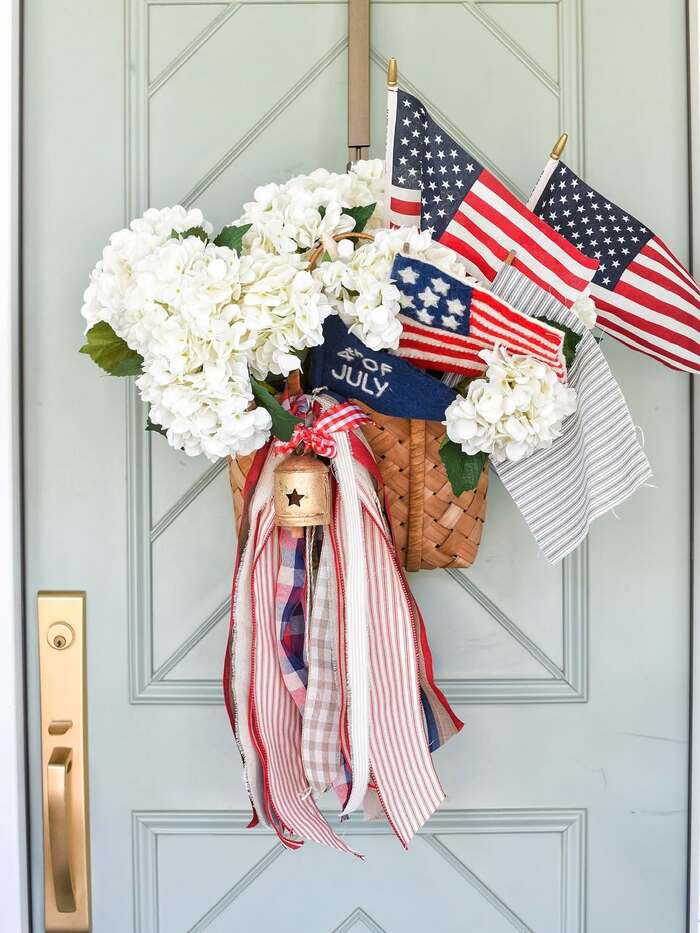 One photo was actually a summer door basket full of flags, which made me laugh because it reminded me how easy it is to swap seasons. Keep the woven basket, then winter it up for outdoor Christmas decorations for front door. I fill mine with faux white hydrangeas, long cedar picks, and two brass jingle bells. Add a tartan ribbon tail down the center to say December, not July. Tie the basket to a strong over-the-door hook so it doesn’t swing like a pendulum when you close the door.